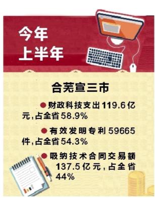 合蕪宣三市財政科技支出119.6億元、占全省58.9%,有效發(fā)明專利59665件、占全省54.3%、增長28.1%,吸納技術(shù)合同交易額137.5億元、占全省44%、增長1.8倍,1~7月高新技術(shù)產(chǎn)業(yè)產(chǎn)值分別增長34.7%、42%和25.2%。
