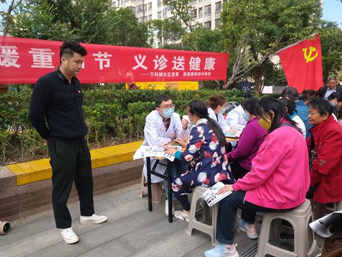 10月12日一大早,陽光明媚,秋高氣爽,萬科城社區(qū)A5區(qū)休閑廣場上,一面鮮艷的黨旗迎風招展,黨委書記周振、副書記何麗和黨員志愿者、黨員中心戶成員肩披紅色綬帶、胸戴黨微在現(xiàn)場為居民服務(wù),社區(qū)工作人員和醫(yī)生共10余人組成的義診服務(wù)隊伍忙碌著擺開了桌凳,“情暖重陽節(jié)  義診送健康”大紅色橫幅格外奪目。許多中老年居民聞訊而至,來自徐州新健康醫(yī)院中醫(yī)科、眼科、口腔科等科室的專業(yè)醫(yī)生很快被前來咨詢和就診的居民“包圍”起來,只見醫(yī)務(wù)人員迅速進入工作狀態(tài),他們有的為老年居民把脈問診,有的為居民測量血壓,有的用儀器精心檢查眼睛……,醫(yī)生們邊做檢查邊耐心聽他們講述各自的病癥,詳細解答咨詢的問題,同時結(jié)合老年朋友的咨詢,醫(yī)生們還普及有關(guān)常見病、慢性病的相關(guān)知識和健康科普宣傳,應(yīng)個別居民的請求,社區(qū)領(lǐng)導還陪同醫(yī)護入戶對身體不便的老年人進行義診。