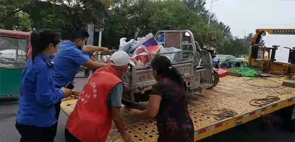 市容二中隊(duì)隊(duì)長徐華林聽到消息后立即驅(qū)車前往,現(xiàn)場看到年長的老人腿腳不便,難以行走,且表達(dá)能力受限。耐心問清她們家的住址,在征得開發(fā)區(qū)分局局長同意后組織隊(duì)員將其三輪電動(dòng)車抬上了中隊(duì)的巡查車,用繩索固定住,并把她們送往安國鎮(zhèn)后王莊村的家中。到了后王莊的家中,兩個(gè)孫輩的孩子正在家中急盼著一天沒有回家的老人。