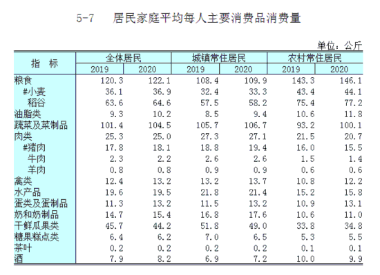 從居民家庭平均每人主要消費(fèi)品消費(fèi)量的統(tǒng)計(jì)來看,全體居民平均每人吃的蔬菜及菜制品為209斤,比2019年多吃了6.2斤;但肉類消費(fèi)減少,平均每人吃掉50斤,比2019年少吃0.6斤。蛋類及蛋類制品消費(fèi)比2019年上漲3.8斤,奶和奶制品則多消費(fèi)掉1.4斤。