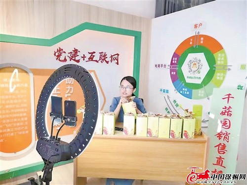 黨員志愿者在黨群服務(wù)中心直播帶貨,幫助群眾增收致富。