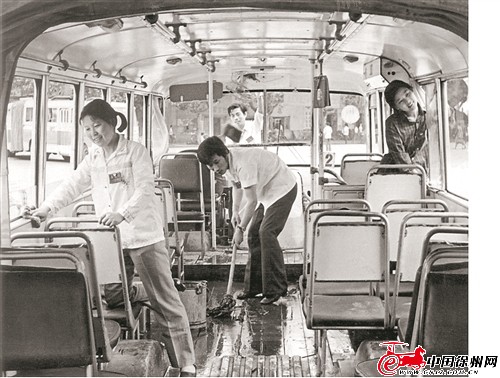上世紀(jì)70年代,工作人員給2路公交車做清潔。