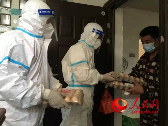南通市通州區(qū)先鋒街道花園村志愿者為居民上門(mén)送生活物資;▓@村供圖