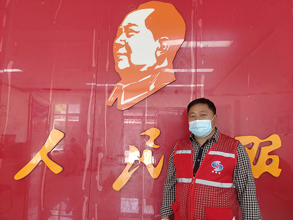薛長(zhǎng)軍 在為人民服務(wù)標(biāo)語(yǔ)下 與毛主席頭像合影