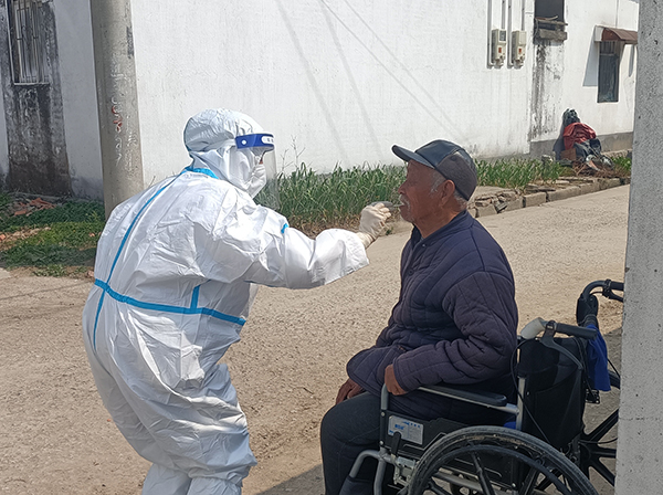 白衣執(zhí)甲,50齡的“高光時刻”。在抗“疫”一線,沒有腳踏七彩祥云的蓋世英雄,但有身披白色“戰(zhàn)甲”的勇士。作為疫情期間全村唯一的醫(yī)務(wù)人員,50歲的土樓村衛(wèi)生室醫(yī)生董彩俠義無反顧身披“白甲”,沖鋒在前。八輪全員核酸檢測中,她所負(fù)責(zé)的采樣點總是開始最早,完成采樣量最大。每次采樣結(jié)束,她總主動請纓,以“我對村里情況熟悉”為由又隨村干部一起為行動不便的村民上門采樣。4月23日,由于當(dāng)日氣溫高,加上高強(qiáng)度的工作,董彩俠在上門采樣途中出現(xiàn)頭暈、干嘔,經(jīng)過短暫的修整消殺,她又踏上戰(zhàn)場,直至完成上門采樣任務(wù),才脫下早已被汗水浸濕的防護(hù)服,為自己輸液。