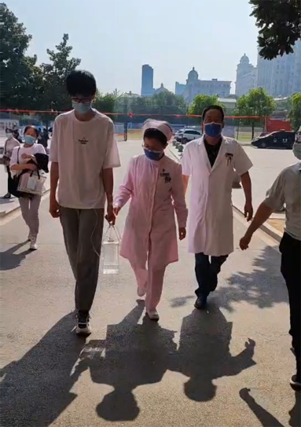6月19日早晨,烈日驕陽,王厚清主任親自上陣,與東院急診病區(qū)朱曉會護士長、轉(zhuǎn)運車護理組共同組成“護衛(wèi)隊”,護送考生到達考點。在考場座位上,朱曉會護士長與王厚清主任反復(fù)確認引流裝置在位通暢,“放松點,沒事的,加油!”王主任安慰考生道,在確?忌踩耐瑫r,也穩(wěn)定了家長不安的情緒。