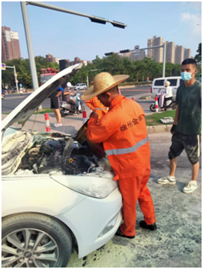 7月1日下午,金環(huán)公司維修隊在104國道與太行路交叉口進行公路養(yǎng)護作業(yè)時發(fā)現(xiàn)一輛白色轎車停在路邊,隱隱冒著白煙。經了解,該車引擎出現(xiàn)自燃情況,需要緊急處理,而車上沒有自備滅火器。正值下班車流量高峰期,如不及時救援,可能會引起更大的危險。維修隊負責人立即做出安排,將在場的員工分成二組,一組負責維持現(xiàn)場交通秩序、一組負責在周邊尋找滅火器。經努力,維修人員及時從一輛公交車上借到滅火器,同時從附近河邊取水,不顧危險進行緊張撲救,及時消除險情,也為車主最大限度減少損失。