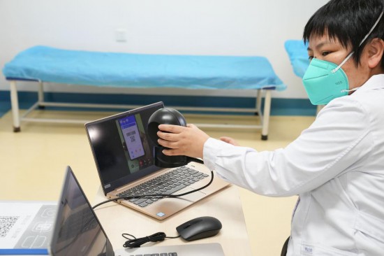 5月23日,在北京市豐臺(tái)區(qū)盧溝橋社區(qū)衛(wèi)生服務(wù)中心,醫(yī)務(wù)工作者通過視頻連線的方式為預(yù)約上門治療的患者掃描電子醫(yī)?āP氯A社記者 鞠煥宗 攝