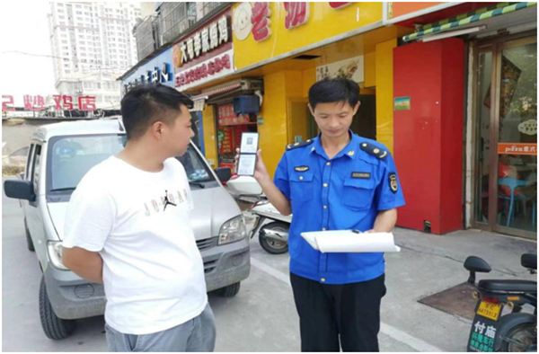 城管執(zhí)法人員對(duì)違規(guī)經(jīng)營(yíng)者進(jìn)行說(shuō)服教育