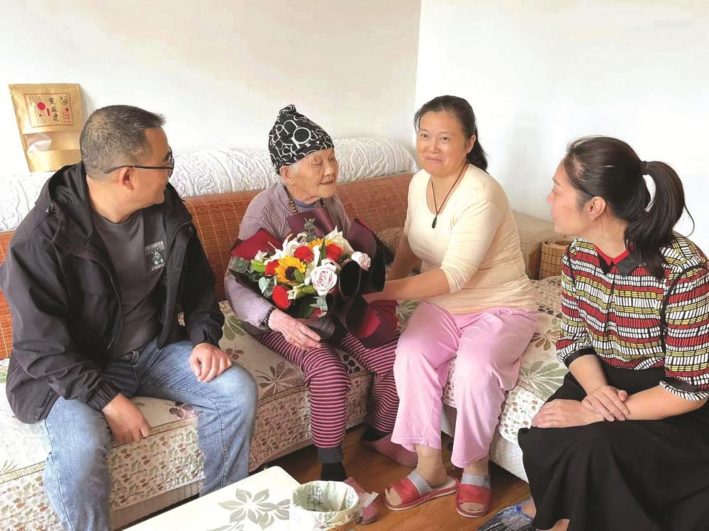 重陽節(jié)前夕,社區(qū)志愿者看望百歲老人。 (資料圖片)