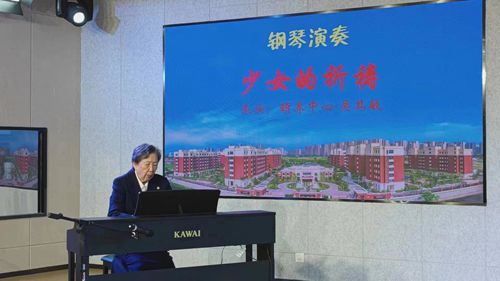 吳其敏老師為大家演奏的是鋼琴獨奏曲《少女的祈禱》,這首鋼琴曲異常柔美又略帶傷感,只聽見清脆的音符如同珍珠落盤般地從吳老師的指間流出,舒緩流暢的樂曲逼真地表現(xiàn)了一個純潔少女美好的心愿。 93歲高齡的她指法嫻熟,這與她六十余年堅持習琴是分不開的,即使到了晚年依然練琴不輟。鋼琴余音未散,同學們便蜂擁而至,獻花合影,把這位年齡最長演出者團團圍在中間,正是“最美不過夕陽紅,最親莫如師生情 ”,場面十分感人。