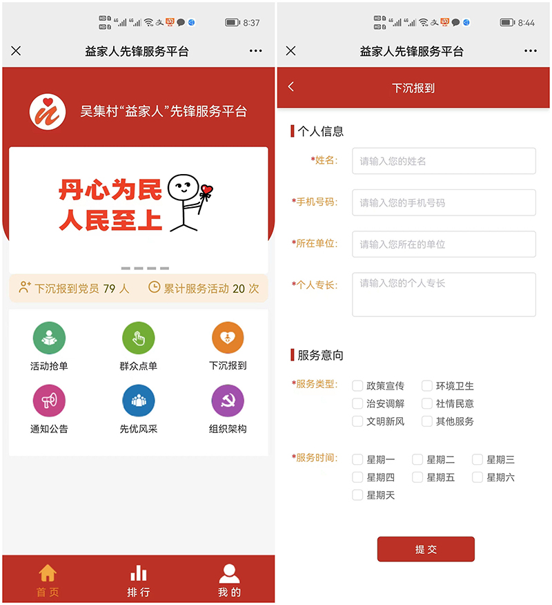 智能登記,黨員報(bào)到更快捷。依托村“益家人”先鋒服務(wù)平臺專欄,報(bào)到黨員和本支部黨員即可在線完成注冊、報(bào)到,根據(jù)個(gè)人的專業(yè)特長和服務(wù)意愿,后臺自動匹配對應(yīng)的活動。截止目前,共計(jì)組建專業(yè)服務(wù)隊(duì)2個(gè),應(yīng)急突擊隊(duì)2個(gè),79名黨員完成實(shí)名制注冊,下沉報(bào)到,服務(wù)類型涵蓋政策宣傳、環(huán)境衛(wèi)生、治安調(diào)解、社情民意、文明新風(fēng)等其他服務(wù)。