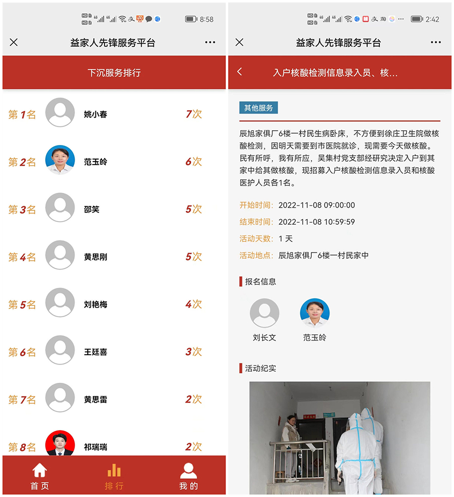 按需派單,服務(wù)活動更精準(zhǔn)。利用線上+線下的方式廣泛宣傳村“益家人”先鋒服務(wù)平臺的作用和使用方法,讓群眾踴躍參與在線點(diǎn)單,支部根據(jù)點(diǎn)單需求發(fā)布服務(wù)活動完成派單,鼓勵(lì)黨員及時(shí)參與接單,確保服務(wù)活動更加精準(zhǔn)。2022年11月8日,住在辰旭家俱廠6樓的村民韓靜在“益家人”先鋒服務(wù)平臺點(diǎn)單,說其老公心臟衰竭,腦癱病情加重,臥床不起,第二天要去醫(yī)院復(fù)診,需要及時(shí)入戶做核酸。村黨支部收到群眾點(diǎn)單短信提醒后,迅速和韓靜取得聯(lián)系,并在平臺上發(fā)布核酸檢測信息采集員和醫(yī)護(hù)人員招募令,將招募令鏈接發(fā)到黨員微信群,通過后臺匹配,徐莊衛(wèi)生院報(bào)到黨員劉長文和在職黨員范玉皊積極響應(yīng),很快接單,精準(zhǔn)完成了該村民的微訴求。村民韓靜激動地說:“真是太感謝你們啦,給我們解決了一個(gè)大難題。”吳集村共有常住村民2060人,截至目前,村民注冊1180人,注冊率達(dá)57%,已接收群眾點(diǎn)單52個(gè),支部派單50個(gè),黨員接單50個(gè),群眾滿意度達(dá)100%。