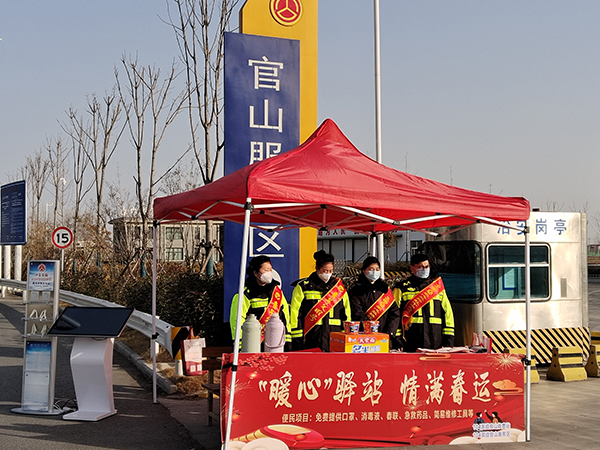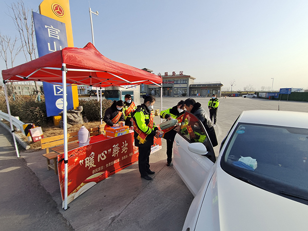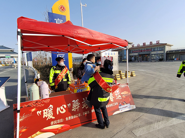 暖心服務二:志愿者們?yōu)檫^往司乘人員免費提供熱水,泡面,免費移動充電,路況查詢,測量血壓等一系列便民服務,讓更多的駕乘人員感受到滿意的熱情服務。