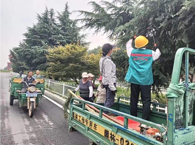 河南省鶴壁市淇濱區(qū)園林綠化中心工作人員對(duì)障目行道樹進(jìn)行修剪。鶴壁市淇濱區(qū)園林綠化中心供圖