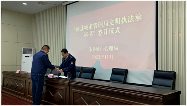 專題黨課結(jié)束后,就城管領(lǐng)域執(zhí)法規(guī)范化建設(shè)工作要求,執(zhí)法人員代表現(xiàn)場簽訂了文明執(zhí)法承諾書,并要求會后全局執(zhí)法人員簽訂承諾書,同時,各鎮(zhèn)(場、街道)也要參照縣局標(biāo)準(zhǔn),制作并簽訂綜合執(zhí)法局文明執(zhí)法承諾書。
