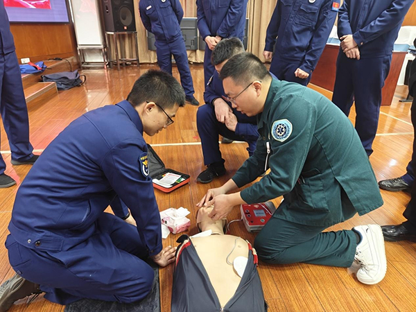 授課活動中,趙明階老師向全體人員普及了心肺復(fù)蘇的定義、急救步驟、注意事項和AED實際應(yīng)用,分享了一些真實的心肺復(fù)蘇成功案例,帶來了豐富的應(yīng)急救援知識。理論授課后,趙明階和程任老師共同實地指導(dǎo)開展實操訓(xùn)練。此次授課結(jié)合了理論講解、案例分析、現(xiàn)場實操、互動問答等元素,內(nèi)容豐富多彩、形式新穎。