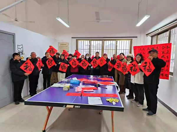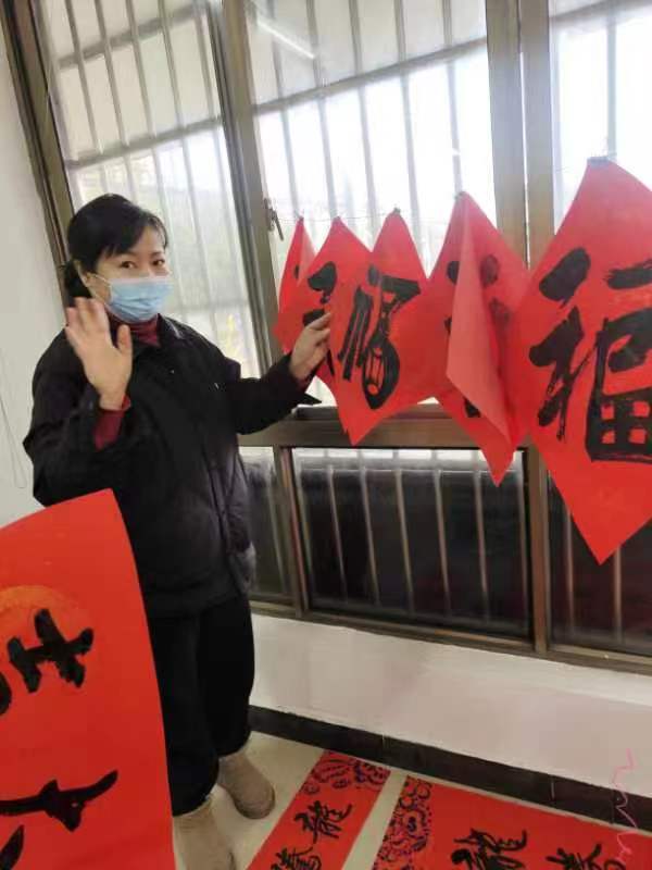 現(xiàn)場(chǎng)準(zhǔn)備的筆墨紙硯很快告罄,一幅幅鮮艷奪目的“福”字、春聯(lián)高高掛起,活動(dòng)室內(nèi)洋溢著一片火紅年味的歡樂(lè)海洋,村民們?cè)谄渲写┧笥^看,不斷拍照留念。兩位老師的書法作品當(dāng)場(chǎng)進(jìn)行贈(zèng)送,活動(dòng)結(jié)束時(shí)每位村民都領(lǐng)到了自己心儀的作品,興奮地說(shuō)“謝謝老師,回去就把它貼在家門上,圖個(gè)新年的好彩頭!”