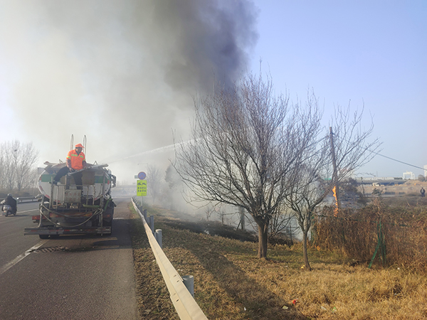 這一切都要從3月12日下午的一場火災(zāi)說起。當日下午,鄭集養(yǎng)護工區(qū)巡查人員在日常巡查時發(fā)現(xiàn)322省道彭城高速口鄭集方向綠化帶冒出滾滾濃煙,并不斷向隔離柵欄和附近停車場蔓延。危急關(guān)頭,養(yǎng)護巡查人員當機立斷,立即撥打火警電話聯(lián)系消防部門前來救援,并在周圍擺放安全警示標志,做好道路交通疏導工作,同時向養(yǎng)護工區(qū)報備。工區(qū)接報后,立即調(diào)度正在附近作業(yè)的灑水車前來支援,先行滅火,幾分鐘后,消防人員趕到,經(jīng)過55分鐘的合力奮戰(zhàn),火勢得到了有效的遏制,現(xiàn)場的明火被成功撲滅。為避免出現(xiàn)復燃隱患,養(yǎng)護人員還對周圍區(qū)域進行仔細檢查,在確認火源被完全熄滅、不存在復燃隱患后才離開現(xiàn)場。