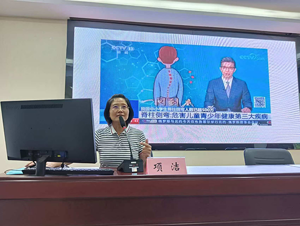 徐醫(yī)附院康復科主任、徐州醫(yī)科大學博士生導師項潔以通俗易懂的語言、圖文并茂的形式,為學生和家長講解了脊柱側(cè)彎的定義、產(chǎn)生的原因、造成的危害以及如何科學防治等。項主任著重分析了影響青少年兒童脊柱側(cè)彎的不良生活習慣,如長期背單肩背包、不良坐姿、躺在床上看書、蹺二郎腿、體育運動不足等,并特別指出:脊柱側(cè)彎已成為危害青少年兒童成長的第三大疾病。
