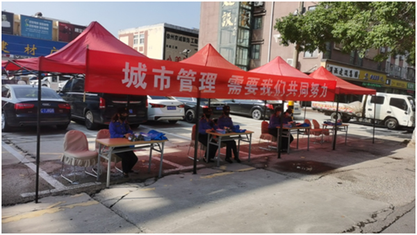 城管局工作人員在沿街進(jìn)行普法宣傳