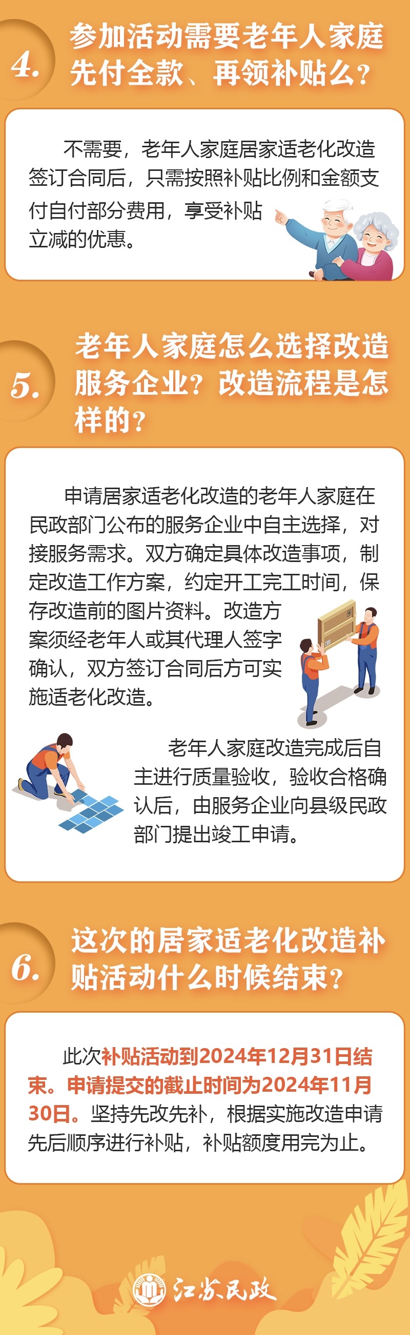 今年7月,國務(wù)院印發(fā)《推動(dòng)大規(guī)模設(shè)備更新和消費(fèi)品以舊換新行動(dòng)方案》,提出持續(xù)推進(jìn)居家適老化改造,積極培育智能家居等新型消費(fèi)。9月,省發(fā)改委、省財(cái)政廳印發(fā)《江蘇省推動(dòng)超長期特別國債資金支持消費(fèi)品以舊換新的實(shí)施方案》,明確將“居家適老化改造”納入超長期國債九大支持領(lǐng)域,落實(shí)惠企利民政策,激發(fā)市場活力,滿足老年人多樣化消費(fèi)需求。