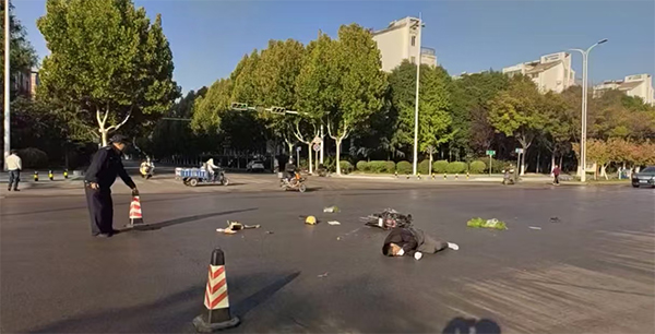 11月6日上午8時(shí)許,新城區(qū)中隊(duì)執(zhí)法隊(duì)員李永志、劉東在韓壩小區(qū)陳平路紅綠燈交叉口周邊執(zhí)法巡查時(shí)發(fā)現(xiàn)一起車禍,一輛電動(dòng)車倒地,隨電車倒地的一名70多歲老人,周圍圍觀群眾較多。