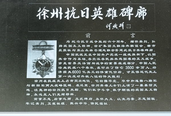 徐州抗日英雄碑廊在2006年1月在泉山森林公園東門內(nèi)側(cè)落成并對外展出,這是全國唯一一座民間抗日英雄碑廊,使徐州又多了一處愛國主義教育基地。