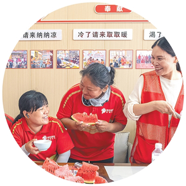 江蘇宿遷經(jīng)濟(jì)技術(shù)開發(fā)區(qū)黃河街道九鼎社區(qū)青島路戶外勞動(dòng)者驛站,志愿者(右一)為戶外勞動(dòng)者送上西瓜和防暑降溫飲品。