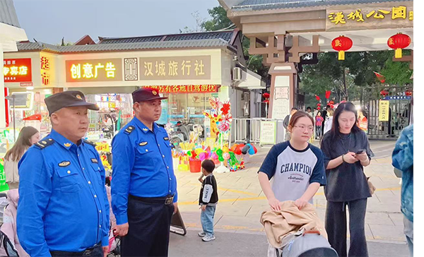 在漢街與漢城路交匯處(游客集中)、九龍城商業(yè)街與漢城路交叉口(消費(fèi)要道)等重點(diǎn)流量點(diǎn)位,“城管執(zhí)勤疏導(dǎo)崗”全天候值守。高峰時(shí)段,執(zhí)勤人員分工協(xié)作:引導(dǎo)行人和非機(jī)動(dòng)車有序通行、提醒市民游客文明禮讓,規(guī)范非機(jī)動(dòng)車停放避免占用盲道,化身“漢鄉(xiāng)活地圖”為游客答疑,全力保障出行順暢。9月30日晚,漢街東門因購(gòu)物人流集中與違規(guī)停車出現(xiàn)短暫擁堵,執(zhí)勤組 5 分鐘內(nèi)完成車輛規(guī)范與人群疏導(dǎo),市民李阿姨點(diǎn)贊:“城管處置真快,過(guò)節(jié)逛街再也不堵了!”​