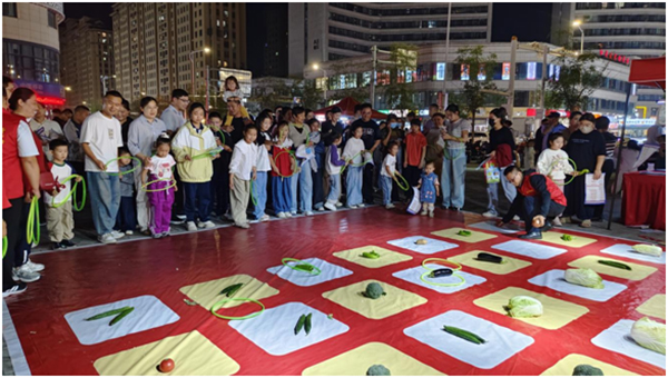 活動(dòng)期間,特意為市民們準(zhǔn)備了100余份新鮮蔬菜作為游戲獎(jiǎng)品,涵蓋大公雞、白菜、蘿卜、土豆、茄子等應(yīng)季食材,既貼合市民日常生活需求,又充滿節(jié)日趣味。游戲規(guī)則簡(jiǎn)單易懂:凡到場(chǎng)市民回答5個(gè)宣傳手冊(cè)上的簡(jiǎn)單問題均可免費(fèi)領(lǐng)取5個(gè)套圈,站在指定線外投擲,套中即可將蔬菜帶回家。截至活動(dòng)結(jié)束,共吸引300余名市民參與,送出蔬菜100余斤,現(xiàn)場(chǎng)笑聲、歡呼聲不斷。市民張大哥提著套中的一只大公雞笑著說(shuō):“既能玩游戲了解生活基本知識(shí)又能免費(fèi)拿大公雞,城管這活動(dòng)辦得接地氣,過節(jié)的熱鬧勁兒更足了!”