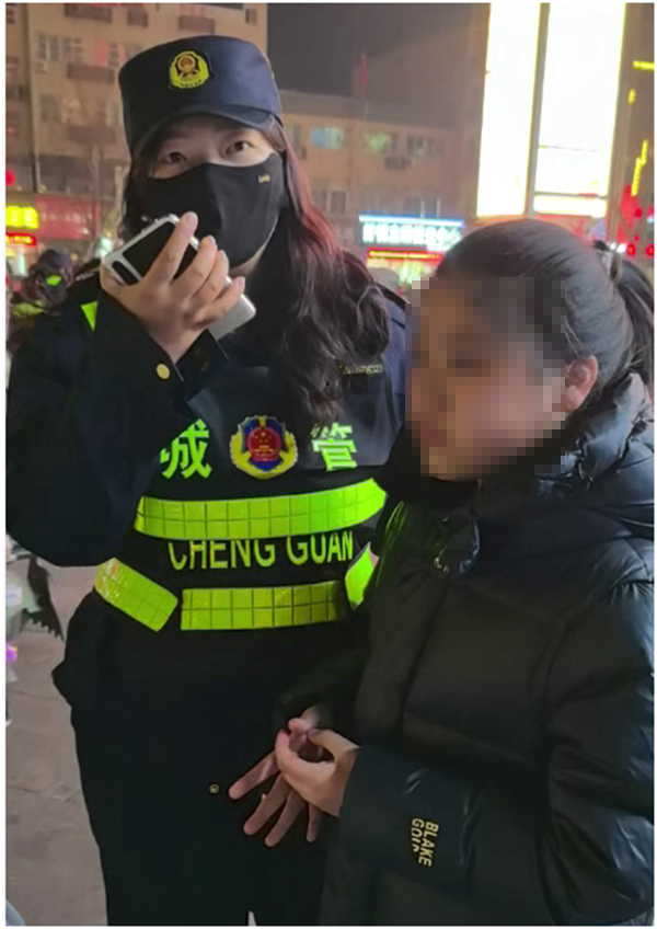 1月3日19時許,城管執(zhí)法隊員吳曉峰、韋丹、孟敏、張曼玉、孫宇、楊璐在城投國際廣場周邊開展例行巡邏。時值元旦假期,廣場內(nèi)游人如織、人頭攢動。巡查途中,細(xì)心的隊員發(fā)現(xiàn)一名約十歲的女孩獨(dú)自在角落默默垂淚,身旁無大人陪同,神情既害怕又無助。
