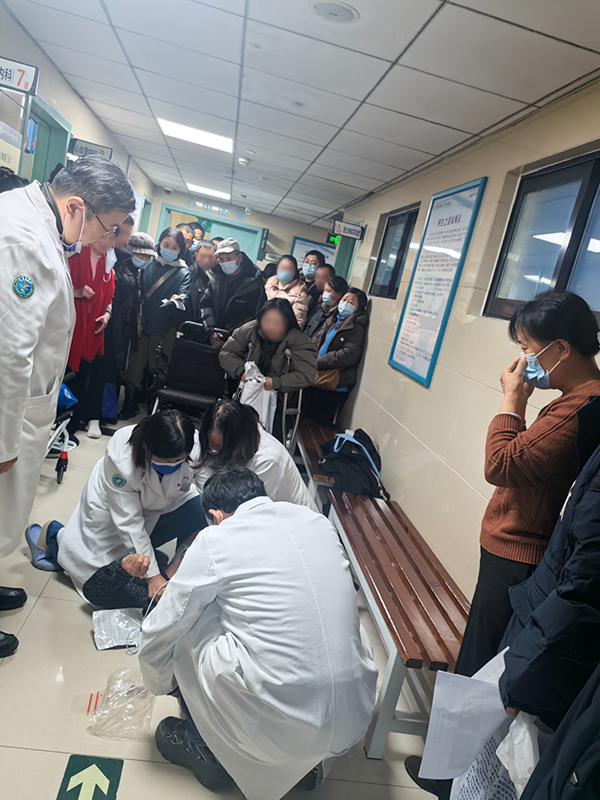 時間回溯至2025年12月24日上午11時15分,徐醫(yī)附院心血管內(nèi)科門診護(hù)士李小梅在例行巡視時,發(fā)現(xiàn)一名患者突然身體僵硬、不受控制地向家屬身上倒去。她立即沖上前去將患者放平。心血管內(nèi)科門診醫(yī)師胡曉芹快速查體,發(fā)現(xiàn)患者面色蒼白、意識喪失伴抽搐、頸動脈搏動消失。兩人當(dāng)機(jī)立斷,判定患者為突發(fā)心臟驟停,立即跪地實施心肺復(fù)蘇。心血管內(nèi)科門診吳皖靈、李承宗、李文華等醫(yī)師聞訊也迅速抵達(dá)現(xiàn)場聯(lián)手施救。