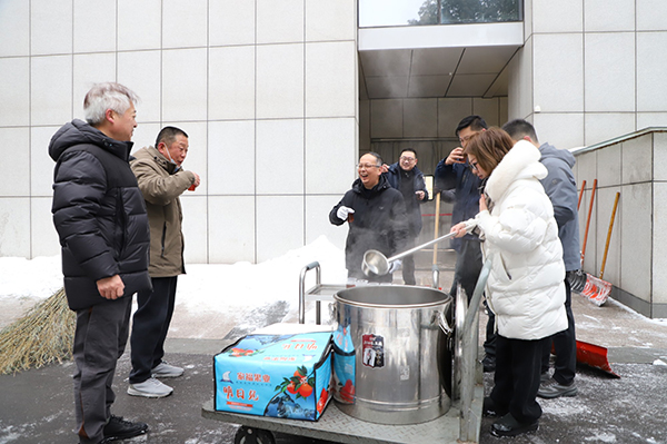 在徐醫(yī)附院鯤鵬路院區(qū),院區(qū)管委會協(xié)同各職能部門積極投入,明確分工,掃除積雪、鋪設防滑墊、設置警示牌,保障患者安全通行。至20日凌晨,各部門干部職工又重點清除了醫(yī)院出入口、地鐵站及周圍主干道、人行道、非機動車道等處不易清理的冰雪,有效保障了職工通勤、患者就診、市民通行安全順暢。膳食管理中心熬制配送了暖心紅糖姜棗湯,不僅為參與除雪的人員驅(qū)散寒意,還為堅守崗位的人員送去溫暖。