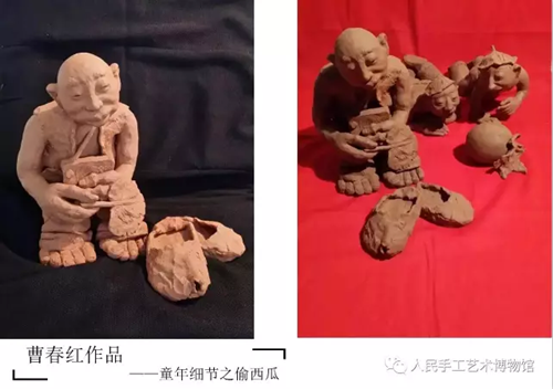 觀她的作品,你很難把那些造型粗獷、潑辣、拙實大氣的人物塑像與眼前這個體型弱弱、皮膚白皙、身材不高的迷你型小女子聯(lián)想到一起。或許是家鄉(xiāng)的黑土地太肥沃、或許是家鄉(xiāng)的泥水太誘人、或許是那些厚道的鄉(xiāng)村故事太令人感動,或許是鄰舍、村娃、父老鄉(xiāng)親刻在她記憶的硬盤里太過深刻,反正在她那數(shù)以百計的泥塑作品中幾乎全部是表現(xiàn)著那些可愛的鄉(xiāng)村生活故事的人與事。