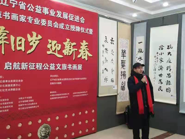 原遼寧省政協(xié)常委、遼寧省社會(huì)主義學(xué)院院長(zhǎng)王本奎代表遼寧公益事業(yè)發(fā)展促進(jìn)會(huì)致歡迎詞。撫順市文聯(lián)主席劉常洪致辭。遼寧省公益事業(yè)發(fā)展促進(jìn)會(huì)主任關(guān)展宣讀遼寧省公益書畫家專業(yè)委員會(huì)成立及聘任任命文件。省公益事業(yè)發(fā)展促進(jìn)會(huì)領(lǐng)導(dǎo)王本奎、關(guān)展揭牌,并向書畫家專業(yè)委員會(huì)授牌,書畫家專業(yè)委員會(huì)張兆林主席、隋桂香常務(wù)副主席接受了牌匾。遼寧省公益事業(yè)發(fā)展促進(jìn)會(huì)領(lǐng)導(dǎo)向公益書畫家專業(yè)委員會(huì)主席、副主席頒發(fā)了聘書。遼寧省書法家協(xié)會(huì)副會(huì)長(zhǎng)趙博海向公益書畫家專業(yè)委員會(huì)顧問頒發(fā)了聘書。撫順市政協(xié)副主席董樹興、撫順市文旅中心主任商澤友、撫順市文學(xué)藝術(shù)聯(lián)合會(huì)主席劉常洪為書畫研究員頒發(fā)聘書。遼寧省公益事業(yè)發(fā)展促進(jìn)會(huì)書畫家專業(yè)委員會(huì)主席張兆林代表首屆班子成員在授牌儀式上發(fā)表致辭。文旅中心主任商澤友宣布了本次書畫展啟幕。