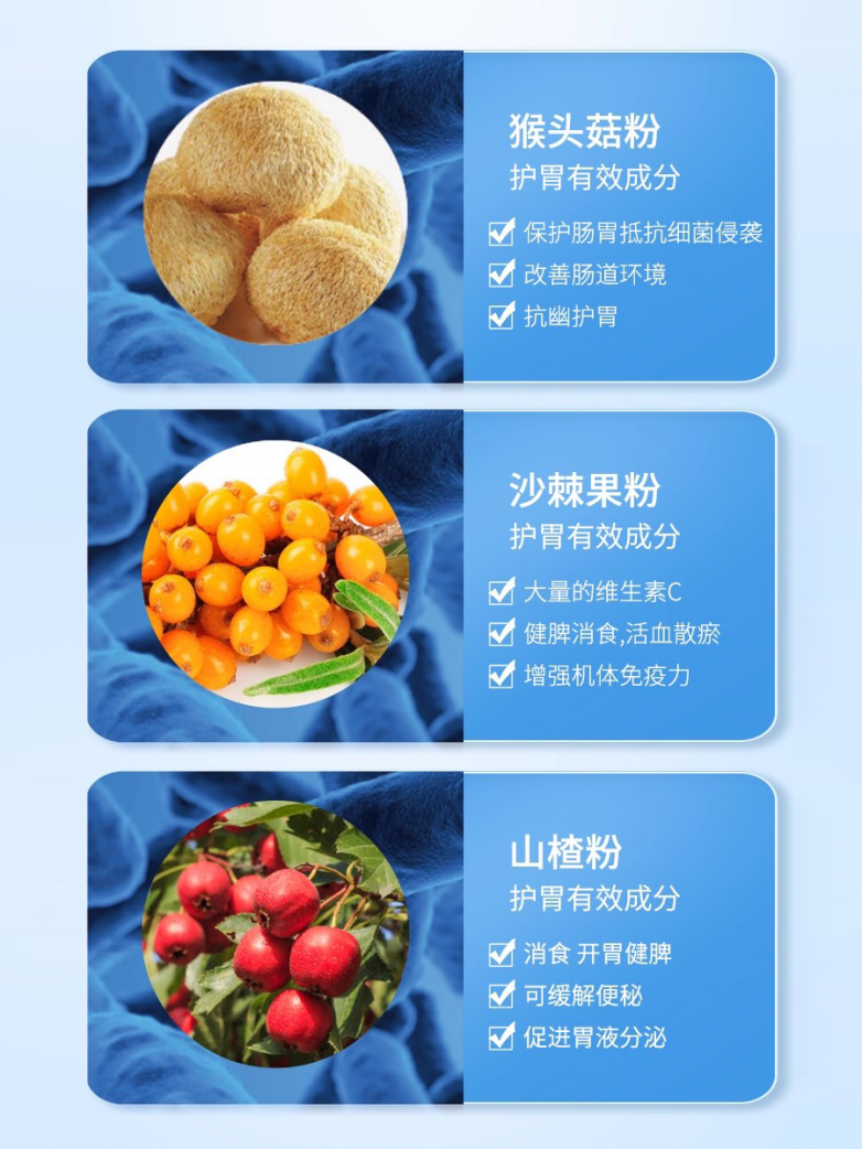 ① 藥食同源植物萃取助力:猴頭菇粉溫和修護(hù)腸胃黏膜,降低腸胃敏感度;山楂粉助消化、化積滯,減輕餐后腹脹不適;沙棘果粉潤養(yǎng)腸道,增強(qiáng)腸胃防護(hù)力,為腸胃平衡營造潔凈的內(nèi)在環(huán)境。