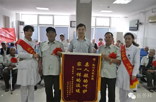昨日,來自徐州市新沂、睢寧等地的重點(diǎn)優(yōu)撫對(duì)象以老戰(zhàn)士療養(yǎng)團(tuán)為中心將一面寫有“親人般的呵護(hù) 家一樣的溫暖”的錦旗送到徐州民政醫(yī)院院長楊永密等工作人員手中,以感謝黨和政府對(duì)他們的關(guān)心與關(guān)愛,感謝民政醫(yī)院工作人員對(duì)他們無微不至的服務(wù)和照顧。