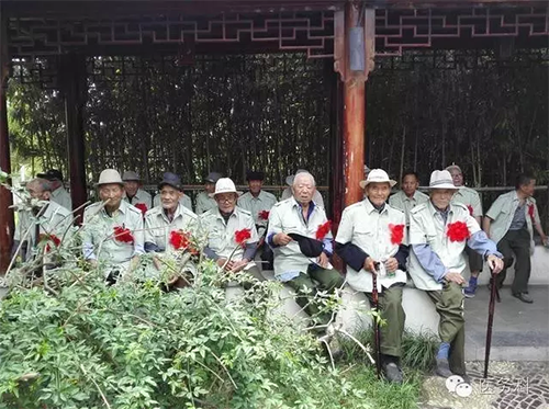 部分睢寧老戰(zhàn)士在賓館式的療養(yǎng)區(qū)內(nèi)合影留念