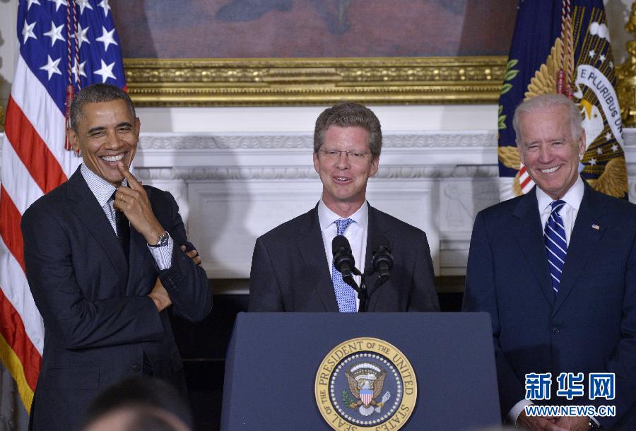 5月23日,在美國(guó)華盛頓白宮,美國(guó)總統(tǒng)奧巴馬(左)、副總統(tǒng)拜登(右)出席肖恩·多諾萬的提名儀式。當(dāng)日,奧巴馬提名現(xiàn)任住房和城市發(fā)展部長(zhǎng)肖恩·多諾萬為新任白宮行政管理和預(yù)算局局長(zhǎng),提名現(xiàn)任圣安東尼奧市長(zhǎng)胡利安·卡斯特羅為新任住房和城市發(fā)展部長(zhǎng)。新華社記者殷博古攝