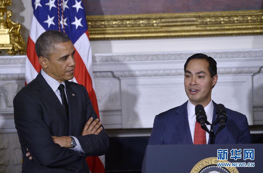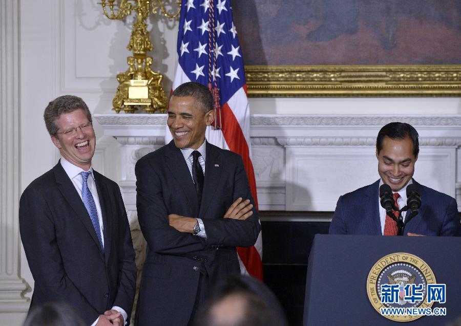 5月23日,在美國(guó)華盛頓白宮,美國(guó)總統(tǒng)奧巴馬(左)和現(xiàn)任圣安東尼奧市長(zhǎng)胡利安·卡斯特羅出席提名儀式。當(dāng)日,奧巴馬提名現(xiàn)任住房和城市發(fā)展部長(zhǎng)肖恩·多諾萬為新任白宮行政管理和預(yù)算局局長(zhǎng),提名現(xiàn)任圣安東尼奧市長(zhǎng)胡利安·卡斯特羅為新任住房和城市發(fā)展部長(zhǎng)。新華社記者殷博古攝