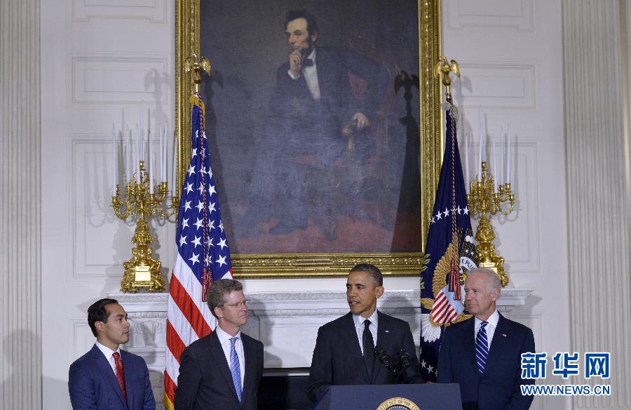 5月23日,在美國(guó)華盛頓白宮,美國(guó)總統(tǒng)奧巴馬(右二)、副總統(tǒng)拜登(右一)出席和胡利安·卡斯特羅(左一)和肖恩·多諾萬的提名儀式。當(dāng)日,奧巴馬提名現(xiàn)任住房和城市發(fā)展部長(zhǎng)肖恩·多諾萬為新任白宮行政管理和預(yù)算局局長(zhǎng),提名現(xiàn)任圣安東尼奧市長(zhǎng)胡利安·卡斯特羅為新任住房和城市發(fā)展部長(zhǎng)。新華社記者殷博古攝