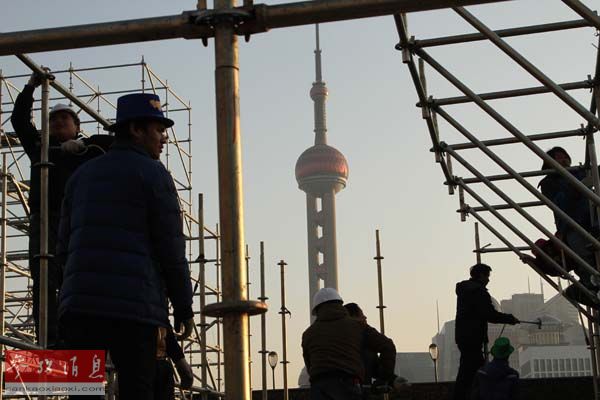 資料圖片:工人在上海外灘一處施工現(xiàn)場忙碌(2013年1月1日攝)。新華社發(fā)