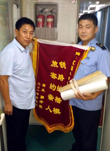 小曹當(dāng)即詢問了乘客,無人認(rèn)領(lǐng),便將圖紙交給了列車長劉午林。經(jīng)過查詢圖紙上遺留的信息,劉午林得知失主為在商丘站下車的旅客郭升俊。此時(shí),郭生俊正為自己大意丟失圖紙而著急。當(dāng)接到劉午林電話后,十分感動(dòng)。由于列車運(yùn)行原因,圖紙暫時(shí)無法轉(zhuǎn)交,經(jīng)旅客同意,列車員于730日在商丘站將圖紙完璧歸趙。為表示感謝,郭生俊特地為列車乘務(wù)組制作錦旗一面。 圖為旅客郭升俊和列車員合影。