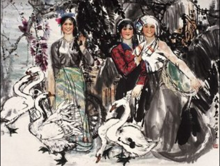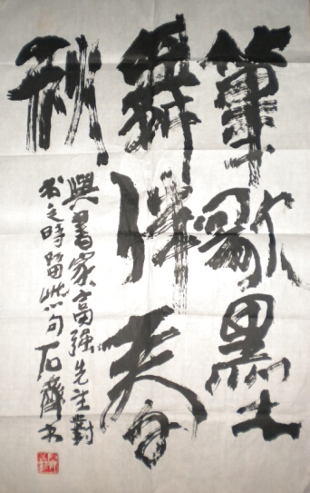 那時(shí)候我先隨他乘車到了北京畫院,在進(jìn)他的畫室時(shí)就看到了許多掛在墻上的大幅油畫,那種色彩的斑斕變化、構(gòu)圖的奇巧、意境的深遠(yuǎn)、用筆的玄妙,都給人一種視覺的沖擊力,至今回憶時(shí)仍歷歷在目。石齊先生介紹了創(chuàng)作時(shí)的激情和動(dòng)力,瀏覽了幾十幅作品后,他又帶我到他家里,看他的作品集,并贈(zèng)送給我一本石齊畫集。采訪之后交流,他得知我也愛好書畫并是中國(guó)神劍文藝學(xué)會(huì)會(huì)員(張愛萍將軍組織的國(guó)防六大部書畫組織機(jī)構(gòu))徐州市職工美協(xié)副主席時(shí),就鋪開宣紙讓我寫兩幅書法,于是我揮毫寫一幅鄭板橋風(fēng)格的書法和一幅篆書,他看后十分贊許。隨后石齊先生給我表演了一幅剛勁有力的四尺三開作品,用筆凝重,飛白自然、靈活,結(jié)體為魏碑和行草,內(nèi)容是:“筆歌墨舞伴春秋。”落款為:“與書家富強(qiáng)先生對(duì)書之時(shí)留此小句,石齊書。”這篇墨寶至今仍珍貴保留。時(shí)近中午,石齊先生熱情地招待,我們?cè)谝患揖频赀x了個(gè)優(yōu)雅的餐位,窗外陽光燦爛,天空碧藍(lán),我和石齊先生對(duì)飲,談笑風(fēng)生。其間又了解到他的成長(zhǎng)道路:1939年生于福建,父母為貧苦農(nóng)民,他自幼愛畫,10歲時(shí)為劇團(tuán)畫布景,從此“小畫家”名號(hào)傳出。1958年同學(xué)在雨中為他送來廈門鷺潮美術(shù)學(xué)校招生書,用母親在全村僅能借到的九元錢,考入美校。中國(guó)畫《鋼》第一次參加廈門市美展并發(fā)表在《廈門日?qǐng)?bào)》上。貧苦的身世,坎坷的歷程,造就了石齊先生堅(jiān)韌不拔、勤學(xué)向上的性格。自學(xué)油畫后,成績(jī)突出,1971年拜黃胄先生為師,創(chuàng)作《家鄉(xiāng)變江南》,《迎春》等作品一舉成名。1974年,李可染大師曾說:“頭一回見到你的畫吃驚的好!”1979年接受文化部創(chuàng)作組安排任務(wù)——創(chuàng)作周總理1961年參加潑水節(jié)。1981年拜劉海粟先生為師,劉老說:“你的畫和我的畫是同一風(fēng)格,畫極好,線有力。”同年受國(guó)務(wù)院“一招”邀請(qǐng)為其繪巨幅創(chuàng)作《草原風(fēng)》。1984年受中國(guó)外交部邀請(qǐng)為中國(guó)兩駐外使館作畫《葡萄熟了》。1990年毛澤東紀(jì)念堂收藏巨幅梅花《正氣篇》。中央電視臺(tái)專題報(bào)道“石齊美術(shù)觀摩會(huì)”。