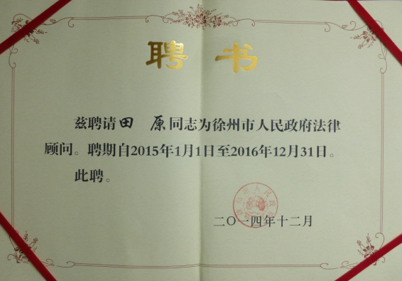 (本網(wǎng)訊:滕富強(qiáng))為貫徹落實(shí)黨的十八屆四中全會(huì)精神,更好的發(fā)揮專家、律師在政府重大行政決策,推進(jìn)依法行政,提升應(yīng)訴能力等方面的積極作用,根據(jù)《徐州市人民政府法律顧問制度實(shí)施規(guī)定》,經(jīng)研究決定,聘任田原同志為市政府法律顧問,自201511日起,聘期兩年,徐州市市長(zhǎng)朱民為田原頒發(fā)了聘書。