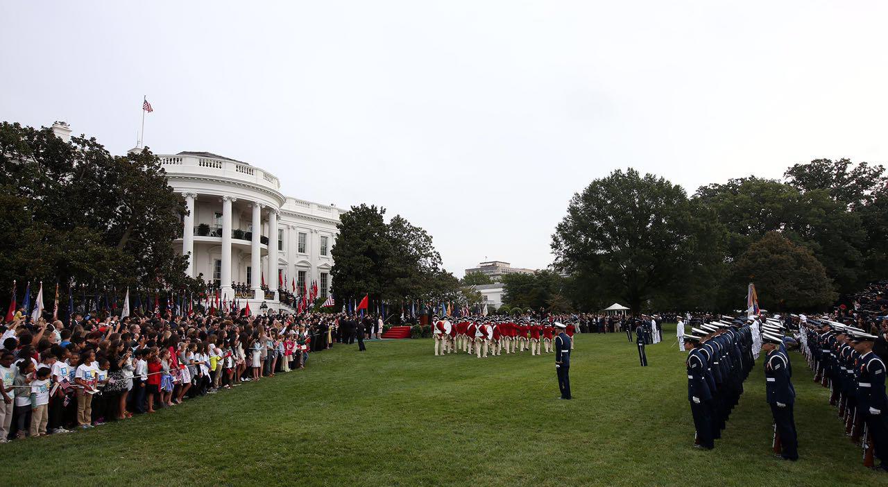9月25日,國家主席習(xí)近平在白宮南草坪歡迎儀式上致辭。圖為歡迎儀式現(xiàn)場。新華社記者 龐興雷 攝