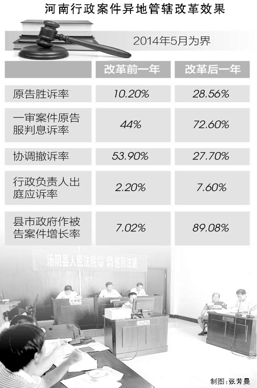 “異地管轄,避免行政權(quán)力干擾,找到了一條群眾監(jiān)督政府的法治途徑,不僅有利于司法公正,而且有助于鞏固黨的執(zhí)政基礎(chǔ)。”河南省高院院長張立勇說。