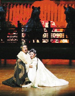 作為歌劇,演員的歌聲動(dòng)人心魄以及惟妙惟肖的演繹,使得觀眾如癡如醉。在劇中,戴玉強(qiáng)所飾演的隋煬帝,呈現(xiàn)給觀眾一個(gè)立體的人物形象,除卻暴虐,同時(shí)還具備一片雄心、萬(wàn)種柔情。殷秀梅所飾演的蕭皇后美艷動(dòng)人卻又剛烈不屈。兩位歌唱家同臺(tái)亮嗓、互飆高音,為觀眾帶來(lái)一場(chǎng)暢快淋漓的視聽盛宴。