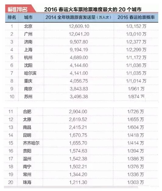 上榜的20個城市中,排名前五的分別是北京、廣州、濟南、上海、杭州。2016年春運火車票搶票難度最大的20個城市中,北京以1/3152萬的搶票概率位居榜首。那么,這1/3152萬的搶票概率是怎么算出來的呢?“標準排名”是這樣統(tǒng)計的:2014年,北京全年旅客發(fā)送量是12609.10萬人次。而“標準排名”預計,春運旅客發(fā)送量是平時的3倍,即3152萬人次(12609.10萬人次÷12個月×3倍)。這個數(shù)據(jù),與鐵路部門公布的2015年北京春運火車旅客發(fā)送量2796.2萬人次比較接近。因此,“標準排名”認為,北京地區(qū)春運火車票搶票概率就是1/3152萬。概率越低,搶票的難度越大。